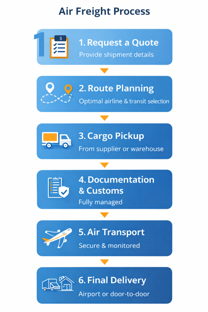 From pickup and customs clearance to final delivery, we manage every step of your shipment. Combine our air freight with , Door-to-Door Logistics, or Warehousing & Distribution for a seamless supply chain solution.