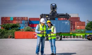 Two female workers in safety vests and hard hats oversee container loading operations at a shipping yard. A crane lifts a yellow container onto a truck, highlighting teamwork and global logistics.