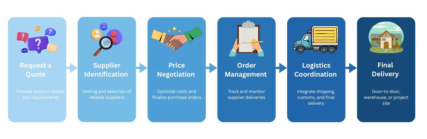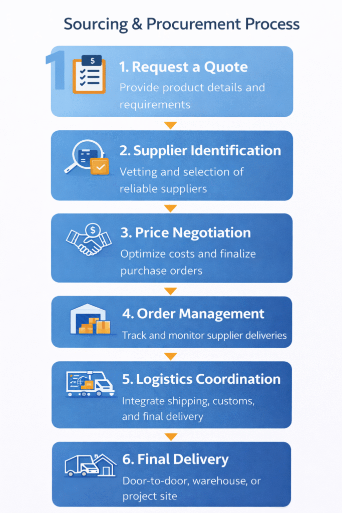We assist with global procurement from suppliers across Asia, Europe, Africa, and the Middle East. Our procurement experts handle international sourcing, supplier coordination, and shipment integration for worldwide delivery.
